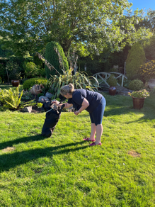 The stage was set and it was time to go, it was all in the ‘paws’ of the pups and whether they were willing to show us their stuff. We are all familiar with the saying 'never work with animals or children'. We’ve all been very gently nurtured as new puppy owners by our Puppy School Tutors to have faith in our dogs. It boggles my mind how the Tutors are seemingly always one step ahead and can see what’s coming before even the puppies can, and they ALWAYS have faith and rightly so. Cue some suspense music (duh, duh, duh - are you singing that in your head) and TEMPTATION ALLEY was good to go! Aside for all the other unique distractions of the day, Tutor Jacki, from Puppy School Gloucester threw in some willing child audience members. What puppy display would be a puppy display without some audience participation or in this instance, audience temptation, evidence of the ‘always have faith’ approach. The children all dutifully stood on their spot as Frankie did his run and he was just perfect, followed by dainty Olive and bouncy Nala. From the garden and with no distraction, Cleo was happy to do a wait and recall, happily galloping towards her Mummy and some fresh chicken. There is no such thing as temptation, when all you want to do is get to your Mummy or Daddy who is armed with some delicious treats. Puppy School advice is- Always be more interesting and exciting to your dog than anything else around them. You could see the handlers really did feel the faith at this point and the sweat running down foreheads really was because of the heat. Of course, the pups needed an opportunity to show off their tricks. Nothing gets an audience melting into the paws of the pups like some cute tricks. They look so easy, but any dog owner will know that it doesn’t come easy, it takes practice, consistency and determination. The pup must want to do it, maybe they want to please or maybe they want another lovely treat in reward for just being amazing. Frankie was up and totally focused, he played boop the button, unfaltering and without hesitation. Then Misty showed us her spin, her amazing high five, even a high ten and finished with the most adorable hugs and kisses which would have the most hardened individual oooooing and arrring. Olive took her spot and did a lovely spin, totally in her own time and when she was ready and then beautifully ‘said’ please for a treat. Then Nala, the baby of the group and panting with heat almost nailed a roll over and did a brilliant spin. Cleo was excited to ‘speak’, spin and sit pretty. It can only be admired the determination of the handlers to teach their dogs these tricks and can only be utterly respected that the skills required by the dog and handler are taught exceptionally well during Puppy School training.